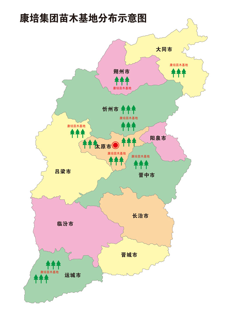 經過20年的發展,康培集團陸續在太原、晉中、運城、忻州、大同、朔州、呂梁等7個地市建立了苗木種植、小苗自繁、苗木快繁、容器苗木、花卉培育等生產基地,培育和儲備了喬木、花灌木、地被等42科300多個品種的不同規格的苗木。